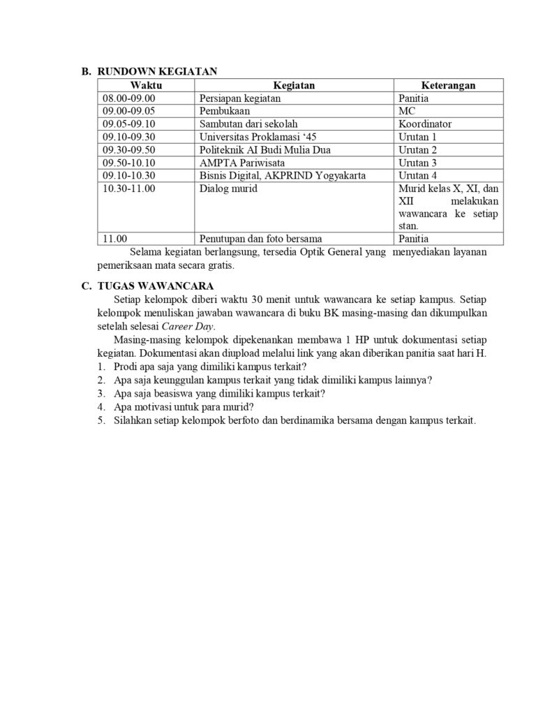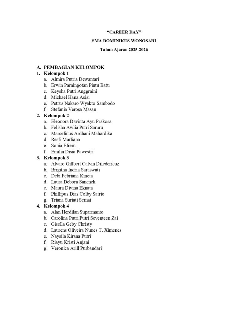 Tugas “Career Day” “CAREER DAY” SMA DOMINIKUS WONOSARI Tahun Ajaran 2025-2026 Hari, tanggal: Kamis, 26 Februari 2026 Waktu: 09.00-11.00